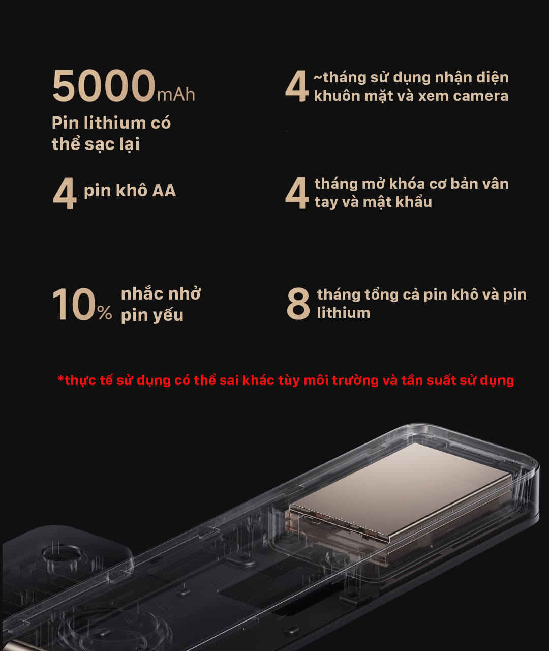 Đặc biệt, khóa được trang bị pin sạc 5000mAh kèm theo 4 pin AA, cho tổng thời gian sử dụng lên đến khoảng 8 tháng, giúp bạn an tâm sử dụng mà không lo lắng về vấn đề pin. ( Pin sạc 5000mAh sử dụng cho hệ thống chuông cửa và bắt wifi nên có thể nhanh hết, pin AA sử dụng cho hệ thống vân tay ).