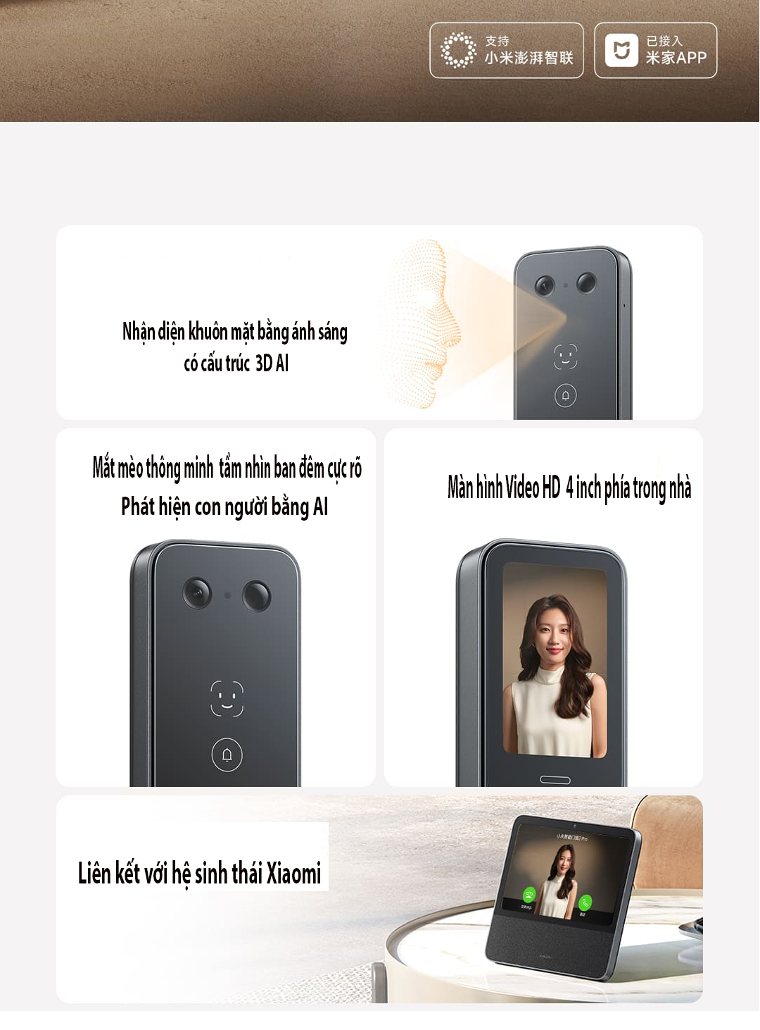 • Cách mở cửa : nhận diện khuôn mặt, vân tay, mật mã, mật mã tạm thời, Bluetooth, thẻ từ NFC ( mua thêm) ,điện thoại xiaomi, đồng hồ xiaomi, vòng đeo tay xiaomi.