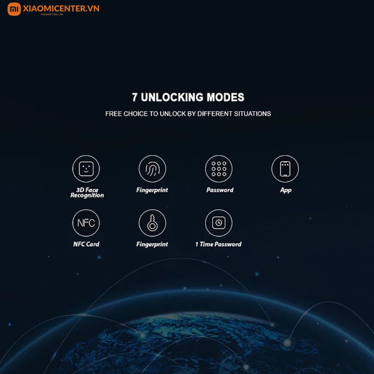 Phương pháp mở khóa: Nhận dạng khuôn mặt, nhận dạng vân tay, mật khẩu, thẻ NFC (mua thêm ), ứng dụng di động, chìa khóa cơ, mật khẩu tạm thời.